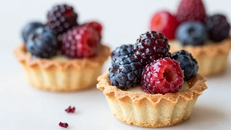 Three fluted pastry tartlets topped with plump, glossy raspberries and blackberries are arranged in a shallow diagonal line, with the central tartlet in sharp focus. Soft, diffused front-side lighting enhances the natural sheen of the berries and the crisp texture of the golden-brown shells, while a shallow depth of field and clean off-white background provide visual clarity and copy space.