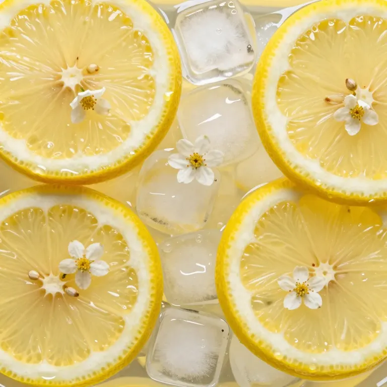 Bright yellow lemon slices with delicate white flowers and clear ice cubes, softly lit to highlight their textures and create a refreshing atmosphere. The minimal background ensures the focus remains on the vibrant and harmonious composition.