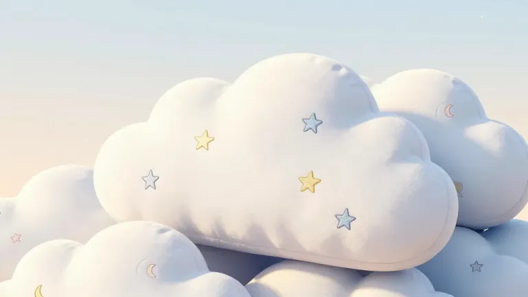 Soft, velvety cloud-shaped pillows adorned with metallic stars and crescent moons, illuminated by diffused light that creates gentle shadows and highlights, set against a subtle gradient of light pastels, enhancing the dreamy, ethereal feel. The shallow depth of field focuses on the pillows, providing ample copy space for design elements.