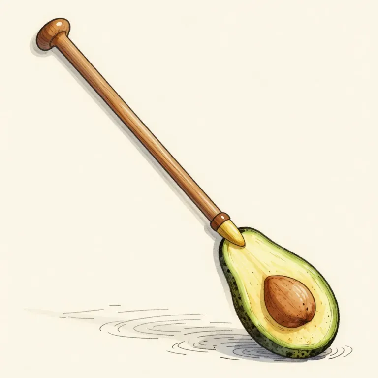 A halved avocado with creamy flesh and bumpy dark green skin is affixed to a polished wooden paddle, resembling a canoe paddle, resting diagonally on a reflective surface with subtle ripple shadows. Soft directional lighting from the upper left highlights the avocado's glossy interior and seed, while shallow depth of field emphasizes the subject against a neutral beige background.