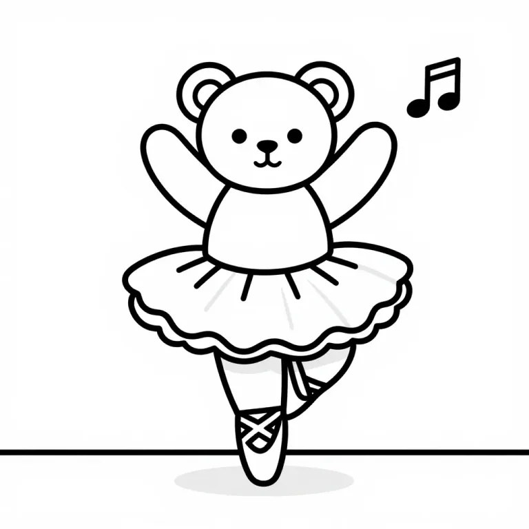 A cartoon bear performs a ballet pose in a scalloped tutu and pointe shoes, with a musical note floating above its head. The image features flat, even lighting with a soft shadow beneath the foot, set against a plain white background with centered composition and ample copy space.