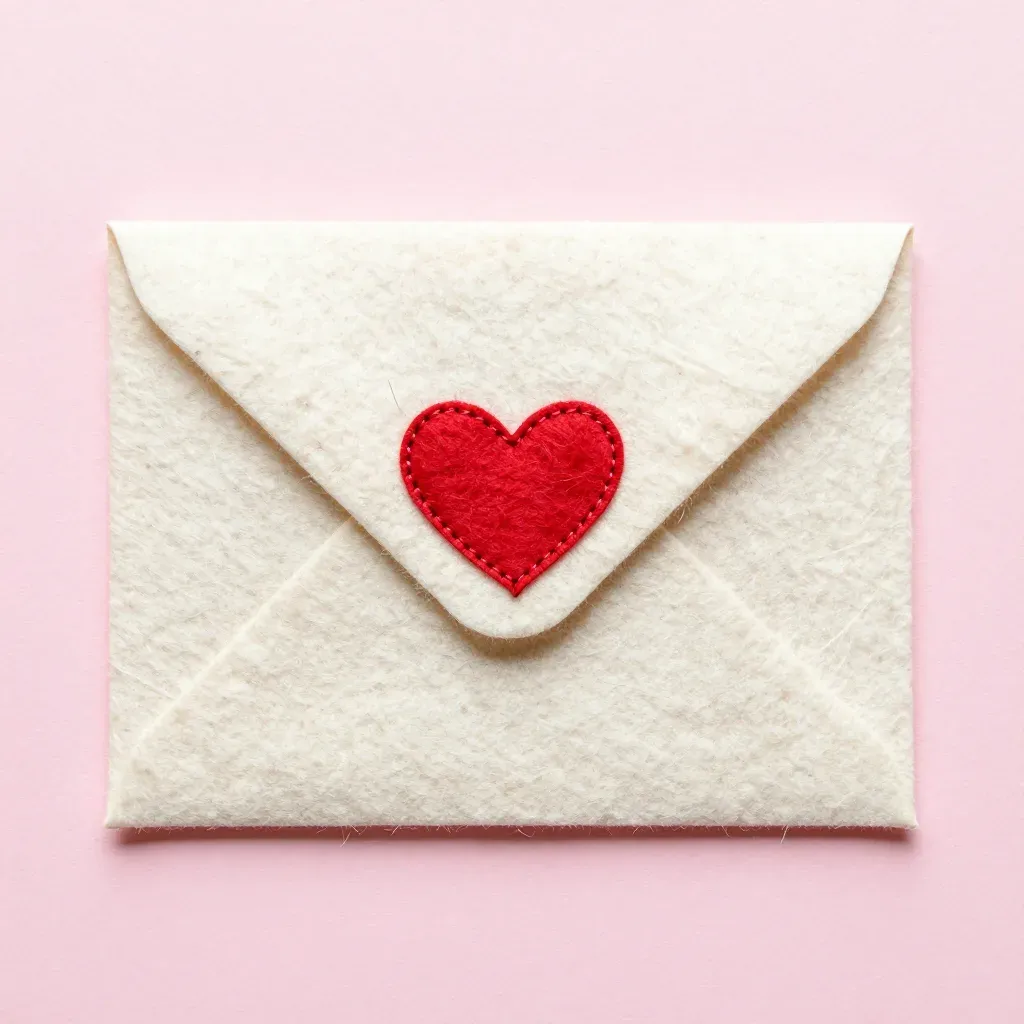 A cream-colored felt envelope adorned with a glossy red heart, softly lit to highlight the textures, set against a gentle pink background, creating a warm and inviting atmosphere. The centered composition with slight tilt adds depth and dimension, ideal for greeting cards or romantic themes.