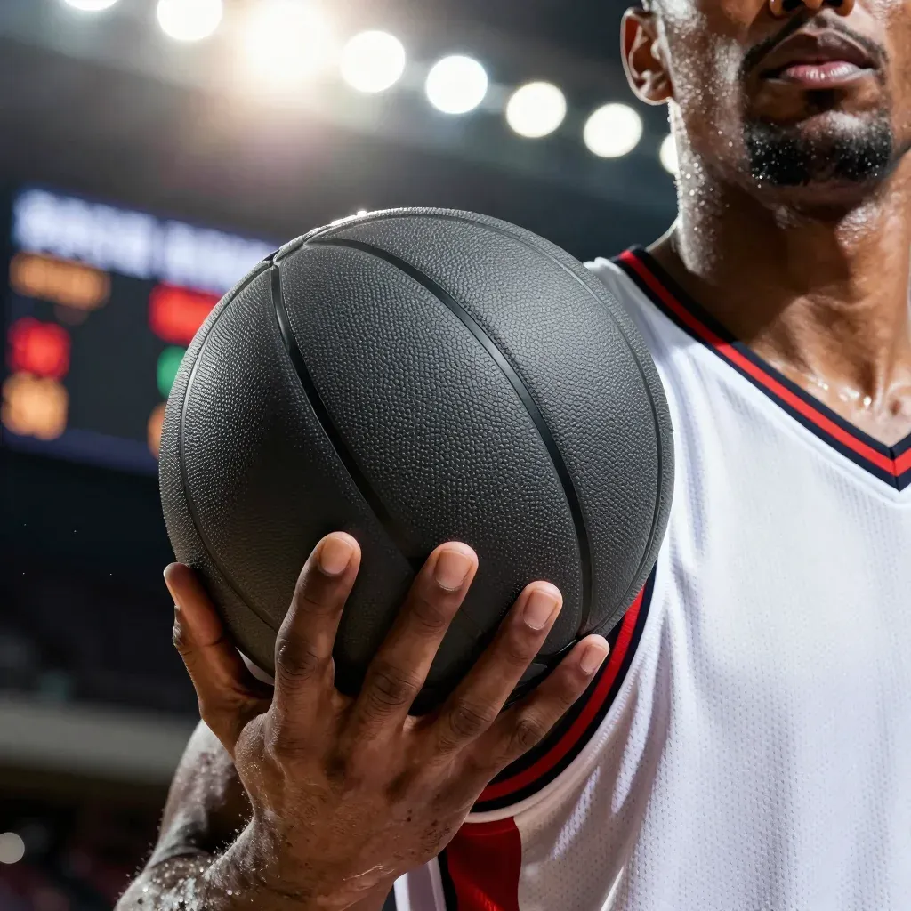 A basketball player grips a textured black ball, sweat glistening on their skin under warm overhead lights. The shallow depth of field blurs the background, focusing attention on the player's hand and face.