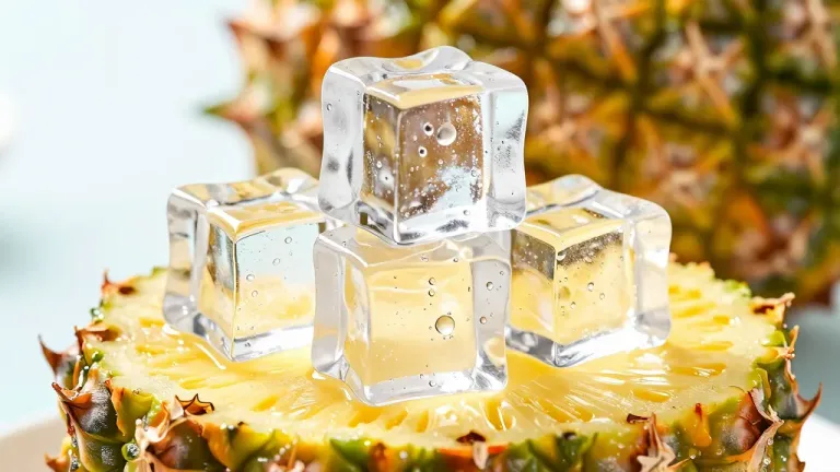 Close-up of ice cubes melting on a pineapple slice, highlighting the contrast between the hard ice and the soft, juicy fruit. The diffused lighting accentuates the textures and vibrant colors, creating a visually striking image with a shallow depth of field.
