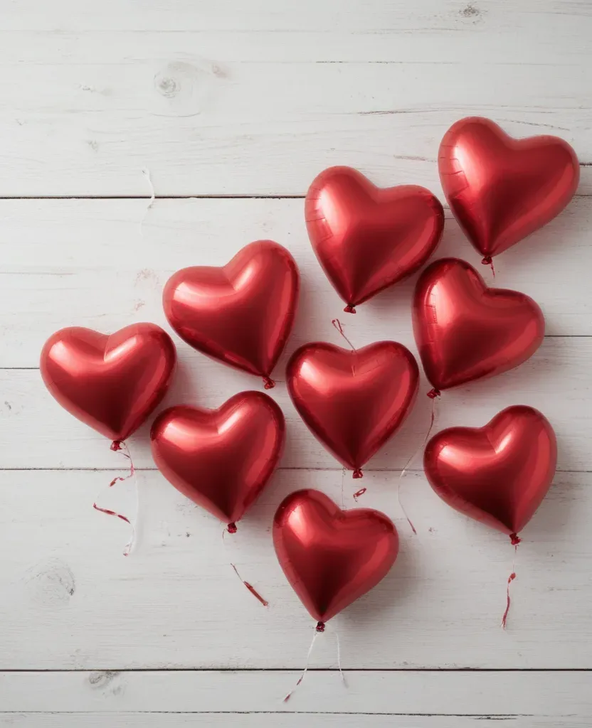 Glossy red heart-shaped balloons rest loosely on rustic white wooden planks, softly lit to highlight their reflective surfaces and create subtle shadows, providing a simple, neutral backdrop that emphasizes the subject.