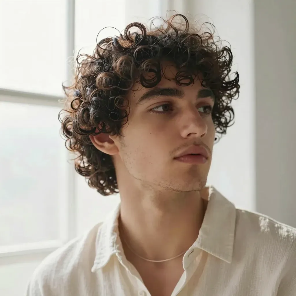 A young man with curly hair gazes upward, his glossy, defined curls catching the soft, diffused light from a window. The warm tones of his hair and skin dominate the scene, creating a serene and contemplative mood. The blurred background with a hint of a window and light streaming through adds depth and a sense of tranquility.