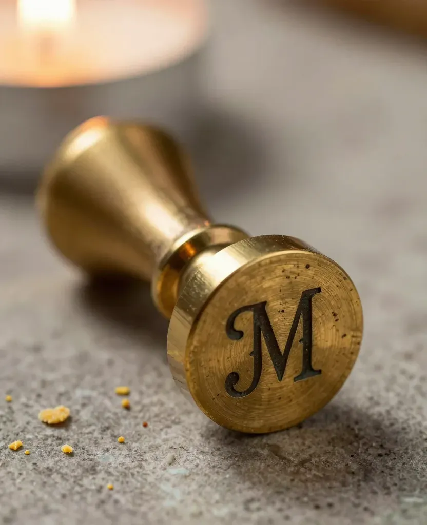 A polished brass signet stamp with an engraved letter 'M' rests on a cool grey stone surface, surrounded by scattered granular wax residue, illuminated by soft warm candlelight. The shallow depth of field and low-angle composition emphasize the stamp's reflective texture and fine engraving, with a blurred background providing clean copy space.