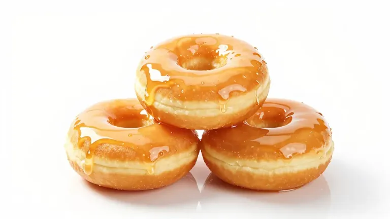 Golden-brown donuts stacked in a pyramid, glossy glaze dripping, soft light creating highlights and shadows, clean white background enhancing focus on the subject.