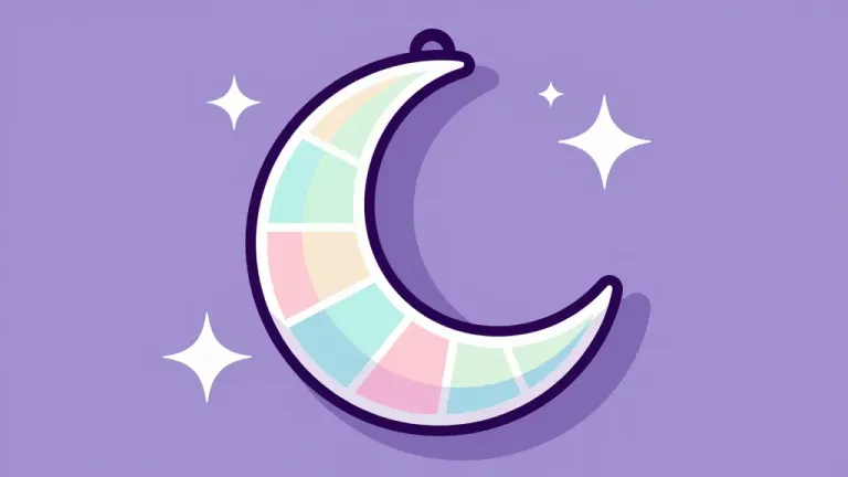 A glossy, smooth crescent moon charm with pastel colors gleams softly against a blurred lavender background, creating a balanced yet dynamic composition with diffused lighting that highlights the charm's surface.