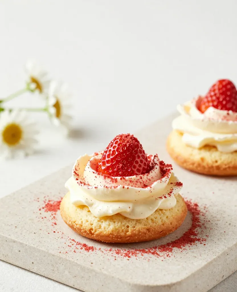 A soft, airy sponge base topped with smooth whipped cream and a juicy strawberry, sprinkled with fine red powder, bathed in soft, diffused light that highlights the dessert's textures and creates gentle shadows, with a shallow depth of field blurring the second dessert and delicate white flowers in the background, adding a serene natural context.