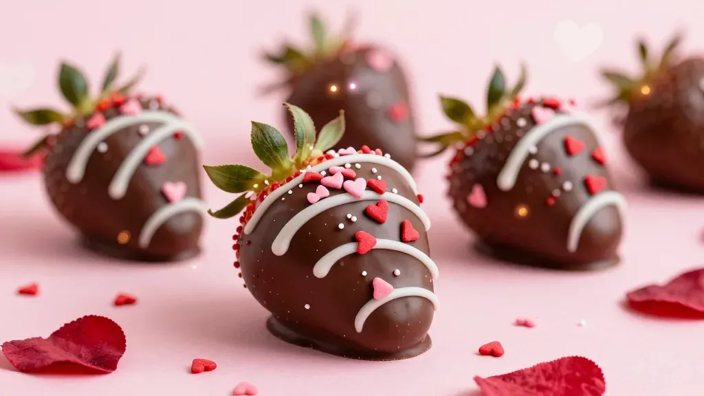 Glossy dark chocolate-coated strawberries are arranged in a shallow cluster, adorned with creamy white chocolate drizzle and fine pink heart sprinkles, set against a soft blush pink surface with scattered rose petals. The image features soft, warm front lighting from the upper left, creating subtle highlights and shallow depth of field that emphasizes the central strawberry while blurring the background for a delicate, romantic aesthetic.