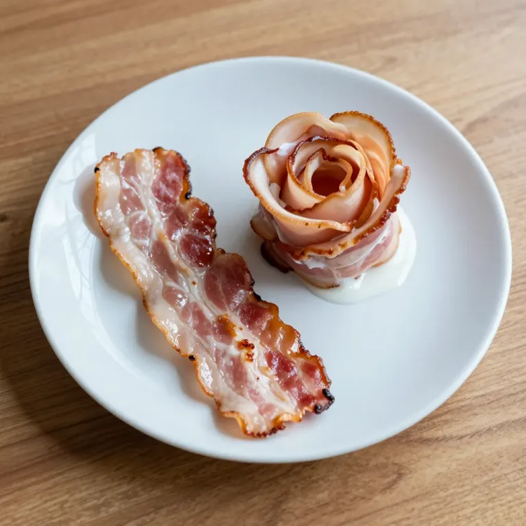 A crispy bacon rose sits elegantly on a white plate, with a single strip of bacon to the side, showcasing its glossy texture and warm tones. The soft, diffused lighting highlights the dish, creating a visually appealing and appetizing presentation against a blurred wooden background.