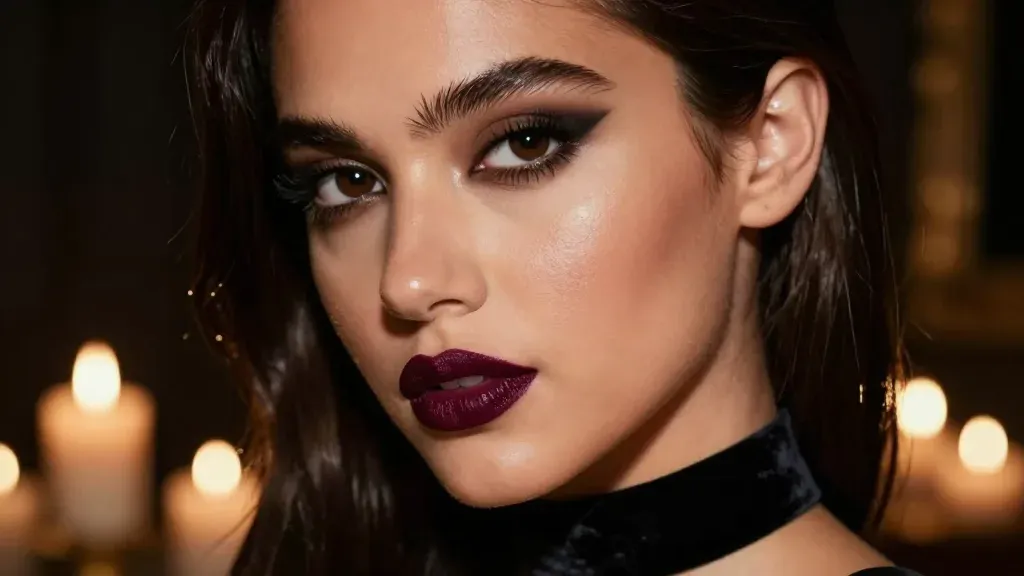 A woman with glossy hair and matte lipstick is captured in a close-up, emphasizing her features and the texture of her hair against a soft, warm candlelit background. The blurred candles create a bokeh effect, enhancing the subject's prominence and adding depth to the composition.