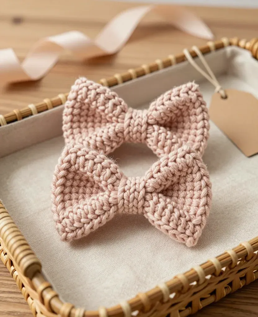 A delicate crochet bow clip in soft pink, intricately crafted with fuzzy yarn, set against a warm, diffused light that highlights its texture and folds. The shallow depth of field and simple wooden background with a blurred ribbon create a clean, minimalistic composition ideal for product photography.