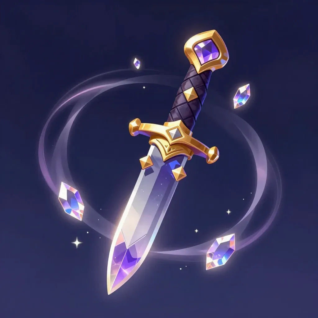 A crystal dagger with a golden hilt and purple gemstone gleams under soft, ambient starlight, casting a magical glow. The deep, dark sky filled with stars and floating crystal fragments enhances the otherworldly setting, providing ample copy space for design elements.