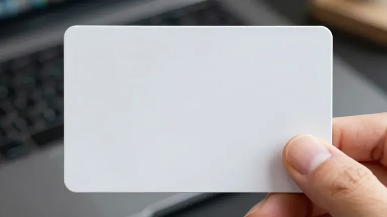A hand delicately grips a smooth, glossy white credit card, illuminated by soft, diffused light that creates subtle highlights and shadows. The shallow depth of field blurs the background, focusing attention on the hand and card, suggesting a clean and professional workspace environment.