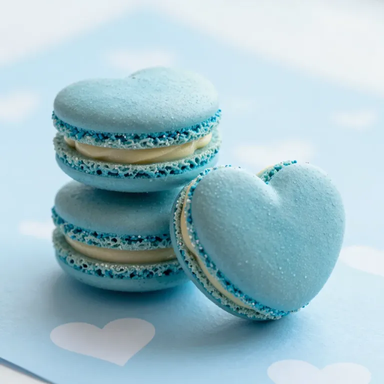 A pyramid of heart-shaped macarons with glossy shells and sparkling sugar edges, softly lit to highlight their delicate texture and creamy filling. The light blue background with faint heart patterns enhances the romantic and elegant mood of the composition.