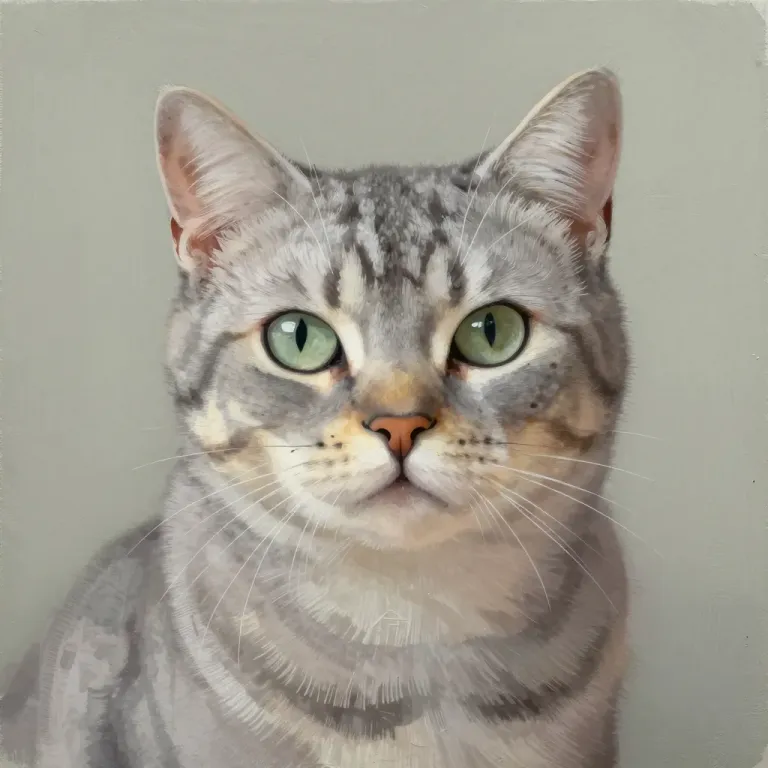 A close-up of a tabby cat with striking green eyes, soft striped fur, and delicate whiskers, illuminated by soft, diffused lighting that highlights the texture and color variations. The neutral, out-of-focus background provides a clean backdrop, emphasizing the subject's direct gaze and serene expression.
