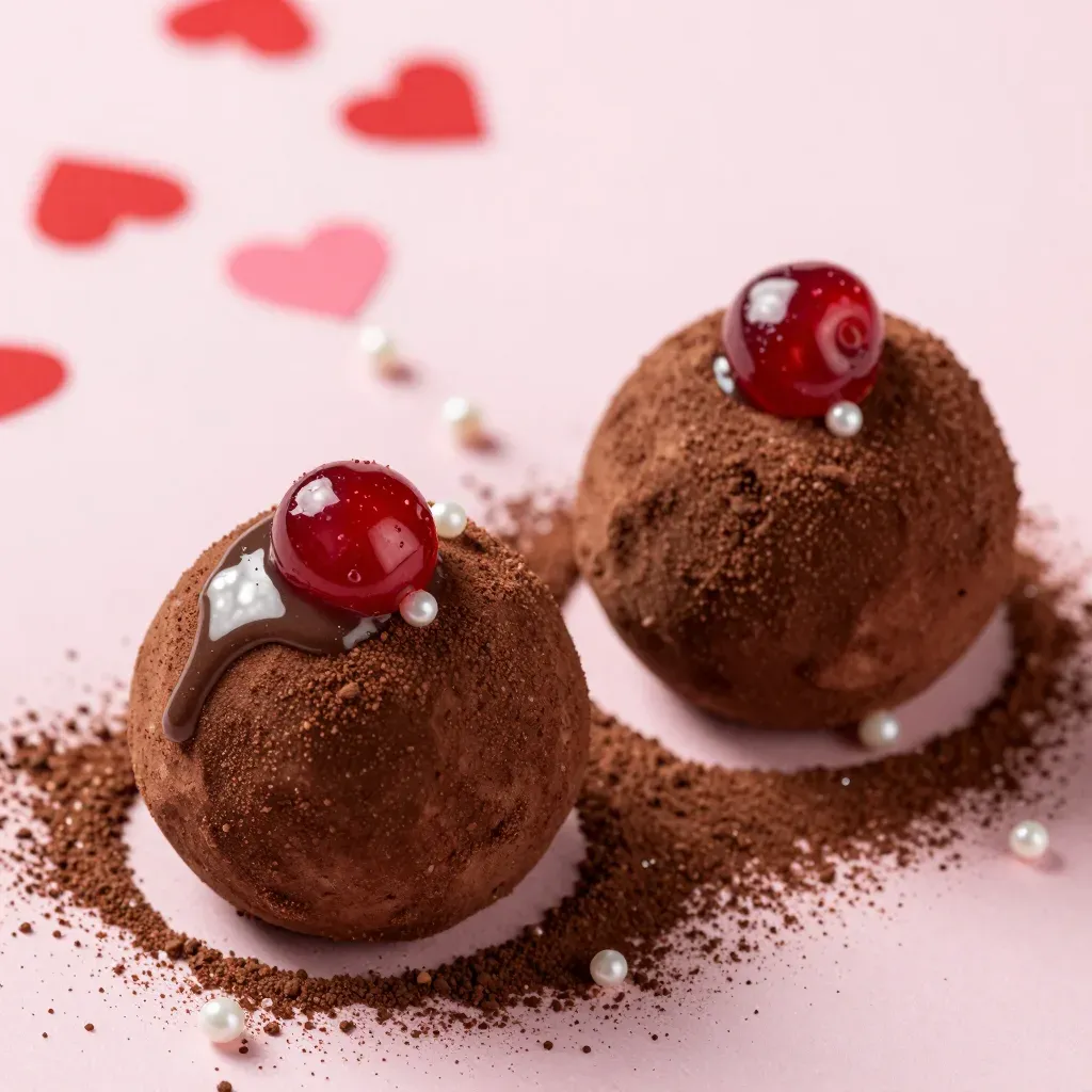 Two cocoa-dusted chocolate truffles are elegantly presented, each crowned with a glossy red cherry and delicate white pearl sprinkles, with a viscous chocolate drizzle adding richness. Soft directional lighting from the upper left enhances the truffles' three-dimensional form and highlights their textures, while a shallow depth of field and scattered heart cutouts create a romantic, festive backdrop with ample copy space.