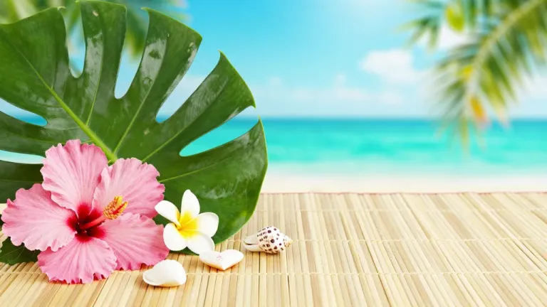 A close-up of glossy monstera leaves and vibrant pink hibiscus flowers on a textured bamboo mat, illuminated by bright natural sunlight, with a blurred turquoise ocean and palm fronds in the background, creating a serene and inviting tropical scene.