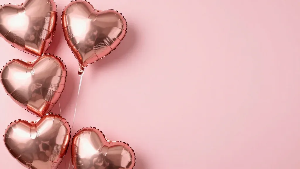 Elegant rose-gold heart-shaped balloons with a metallic sheen and ruffled edges, softly illuminated by diffused, warm lighting, creating a gentle glow. The asymmetrical composition and smooth background provide ample copy space for design elements.