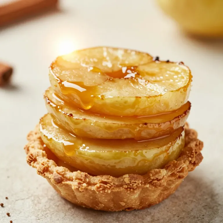 A miniature apple tart features vertically stacked, glossy caramelized apple slices with slight charring, resting on a crisp flaky crust. Soft diffused overhead lighting creates warm golden highlights and gentle shadows, with shallow depth of field isolating the tart against a neutral beige background.