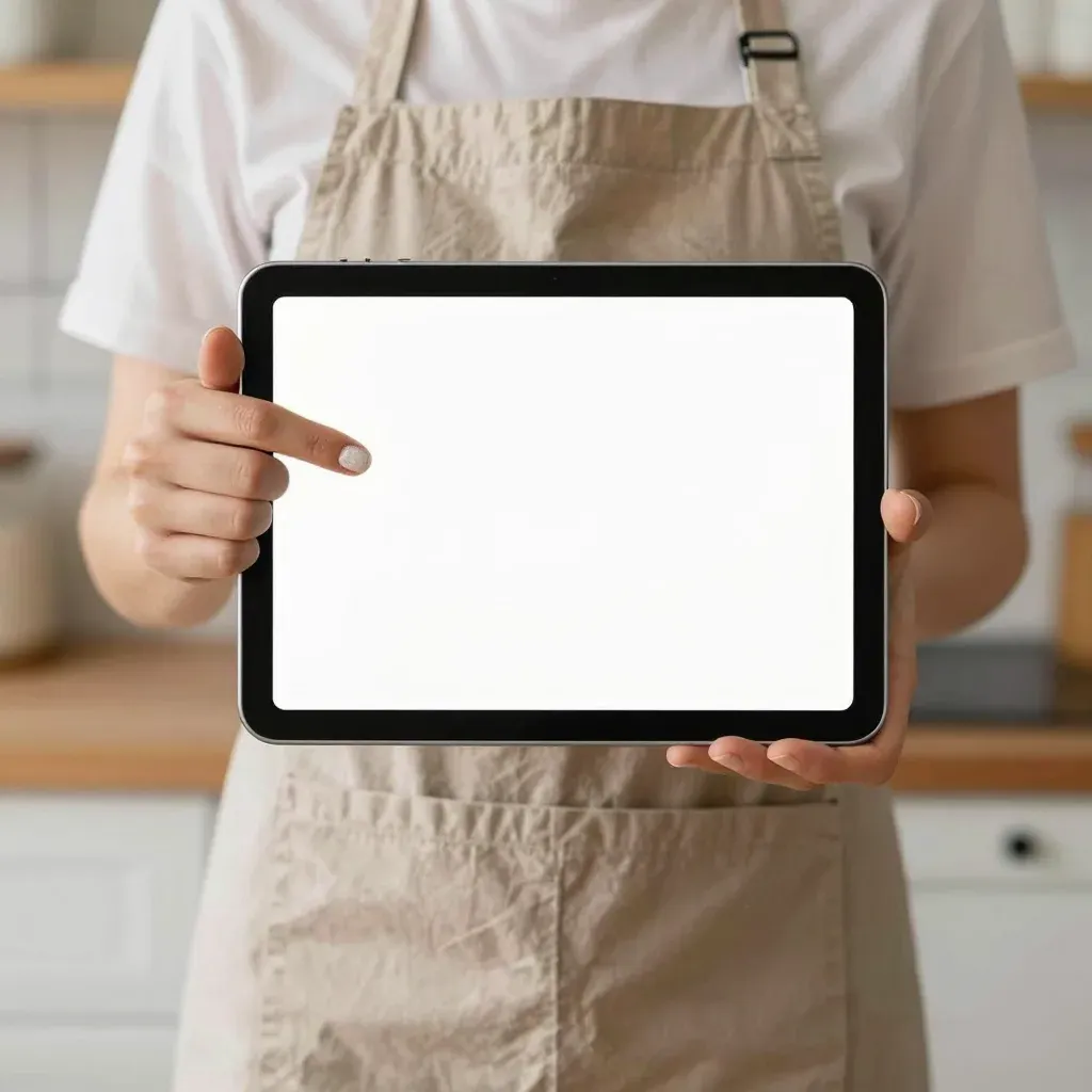 A person wearing a beige apron holds a tablet with a blank white screen in a softly lit kitchen setting. The shallow depth of field draws attention to the tablet, creating a clean and focused composition.
