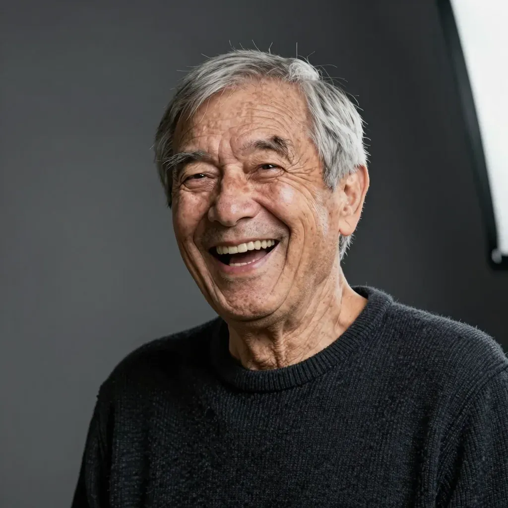 An elderly man, wearing a soft, textured dark gray sweater, smiles warmly under soft, even lighting that highlights his features. The plain, dark gray background, slightly blurred to emphasize the subject, provides a clean and focused composition.