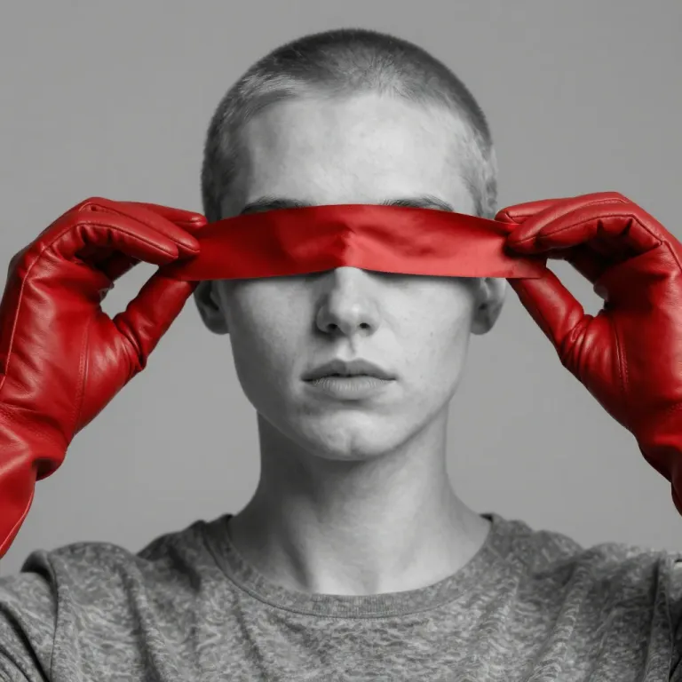 A person with short hair, wearing a gray sweater, uses red leather gloves to cover their eyes with glossy tape. Soft, even lighting highlights the tape and the subject's face, while a neutral, blurred background ensures no distraction from the subject.