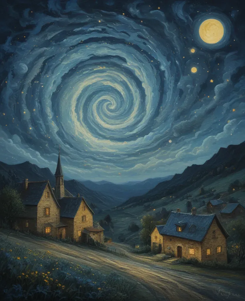 A quaint village with stone houses and steep slate roofs bathed in soft, golden light from windows, set against a swirling night sky and distant mountains. The composition emphasizes the village and the dynamic clouds, creating a sense of depth and tranquility.