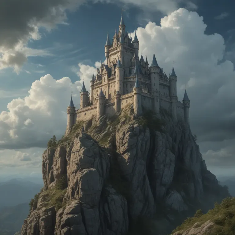 A majestic, weathered castle perches atop a rugged cliff, bathed in soft, diffused sunlight that highlights its intricate architecture and glossy turrets. The rocky cliff and distant mountains frame the scene, creating a sense of grandeur and depth.