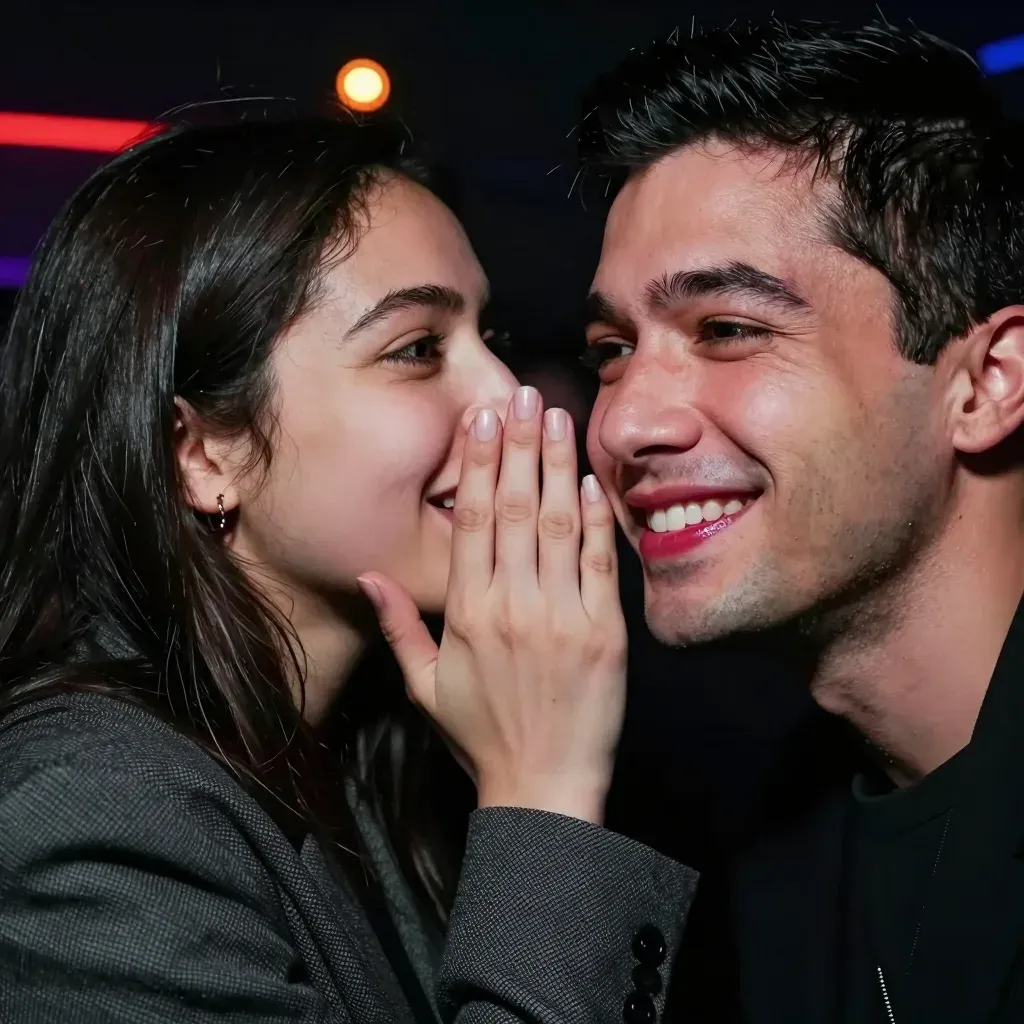 A woman whispers into a man's ear in a dimly lit nightclub, her dark hair glossy and soft, while the man's skin is smooth and slightly stubbly. The warm ambient light highlights their faces and hands, creating a shallow depth of field that blurs the lively background, emphasizing the intimate interaction.