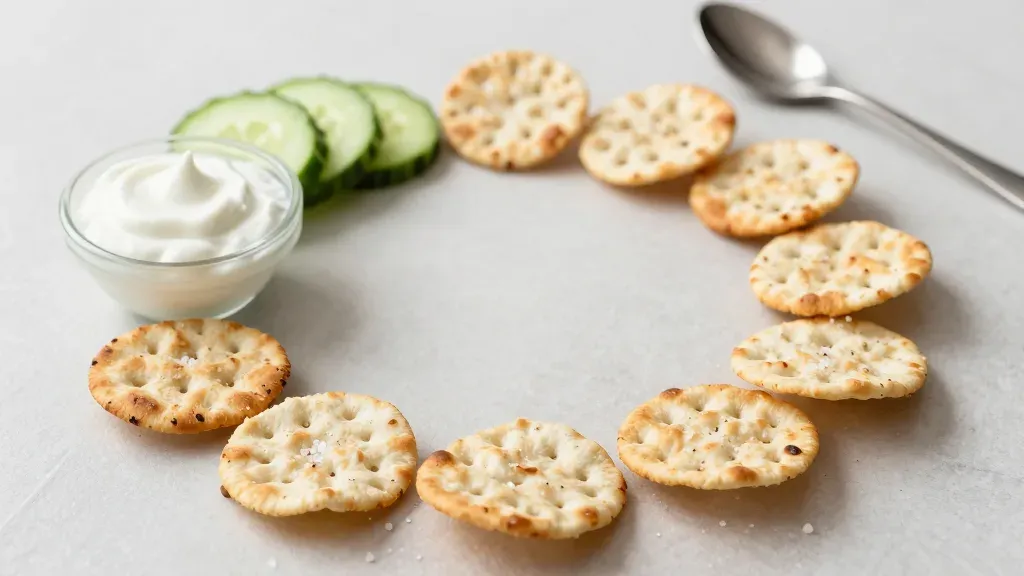 A circular arrangement of crispy salted crackers with fresh cucumber slices and a creamy dip, softly lit to highlight textures and create gentle shadows, set against a clean white background with minimal depth of field.