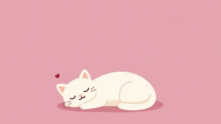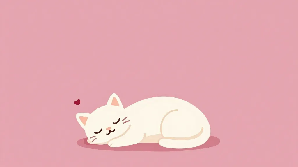 A stylized white kitten sleeps peacefully in a curled position with closed eyes, a small glossy heart floating above its ear, rendered in soft matte fur with subtle gradients. The image features diffuse overhead lighting casting a gentle shadow beneath the cat, set against a solid pink background with ample copy space and a flat 2D composition.