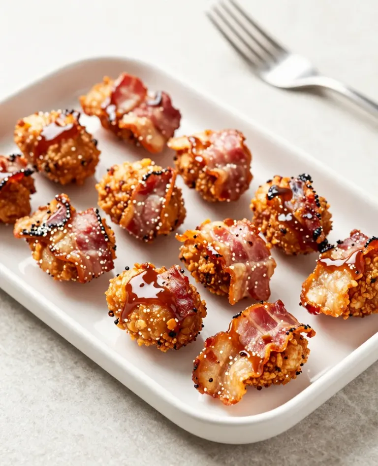 Crispy golden-brown breaded appetizers wrapped in glossy, slightly charred bacon are scattered across a white rectangular platter, suggesting a rich, savory texture. Soft directional lighting from the upper left enhances depth with gentle highlights and shadows, while a shallow depth of field focuses attention on the mid-ground bites against a neutral grey background.