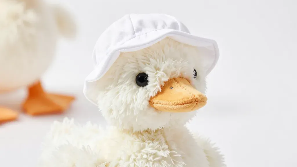A close-up of a soft, fluffy white plush duckling toy wearing a white cap, illuminated by diffused, soft light from above, creating gentle shadows. The shallow depth of field isolates the subject against a blurred, light-colored background, emphasizing the toy's texture and details.