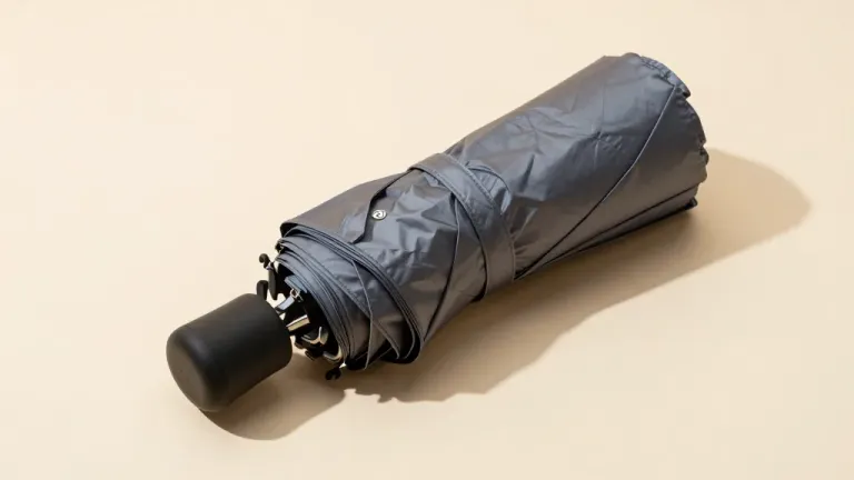A glossy black compact umbrella is folded and lying flat, showcasing its sleek design and texture under soft, diffused lighting. The neutral beige background and slight shadows emphasize the umbrella's form and create a clean, minimalist aesthetic.