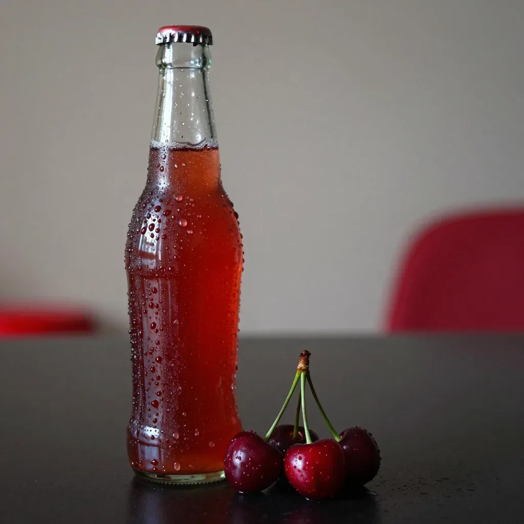 A glass bottle of cherry soda, covered in condensation, stands beside three glossy cherries on a dark matte surface, their deep crimson hues reflecting soft front-left lighting. The shallow depth of field and low-angle perspective emphasize the bottle's height and the cherries' prominence, with a blurred neutral background providing clean separation and depth.