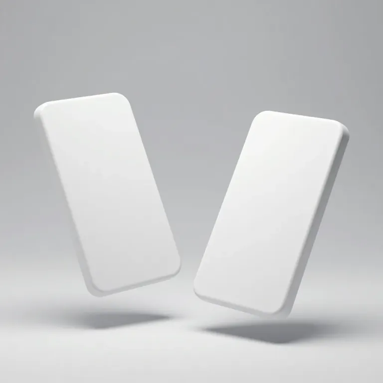 Two glossy white blocks float against a soft, diffused light, casting subtle shadows on a neutral gray background. The balanced composition and clean backdrop make this image ideal for minimalistic designs or product presentations.