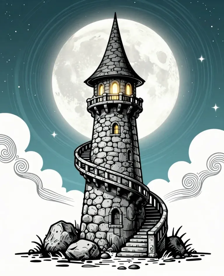 A stone spiral tower with a dark gnarled wood staircase is illuminated by the ethereal light of a full moon, creating a mystical and serene atmosphere. The composition is centered, with the tower dominating the frame, and the swirling clouds in the starry night sky add depth and visual interest.