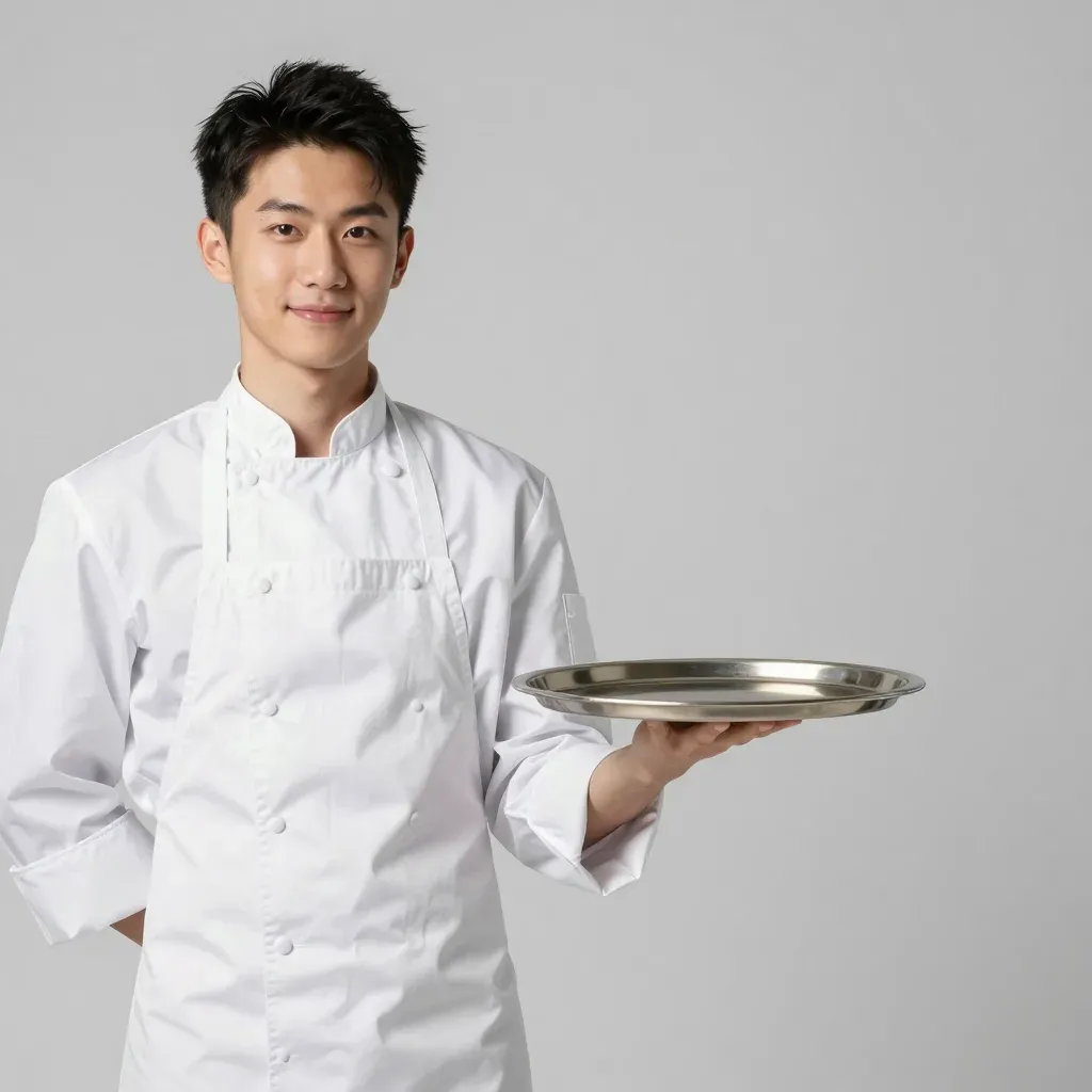 A chef in a crisp white uniform holds a reflective silver platter at chest level, illuminated by soft, even light that highlights the uniform and platter against a plain gray background. The balanced composition and neutral backdrop ensure the focus remains on the chef and the platter, making it ideal for culinary or hospitality-themed content.