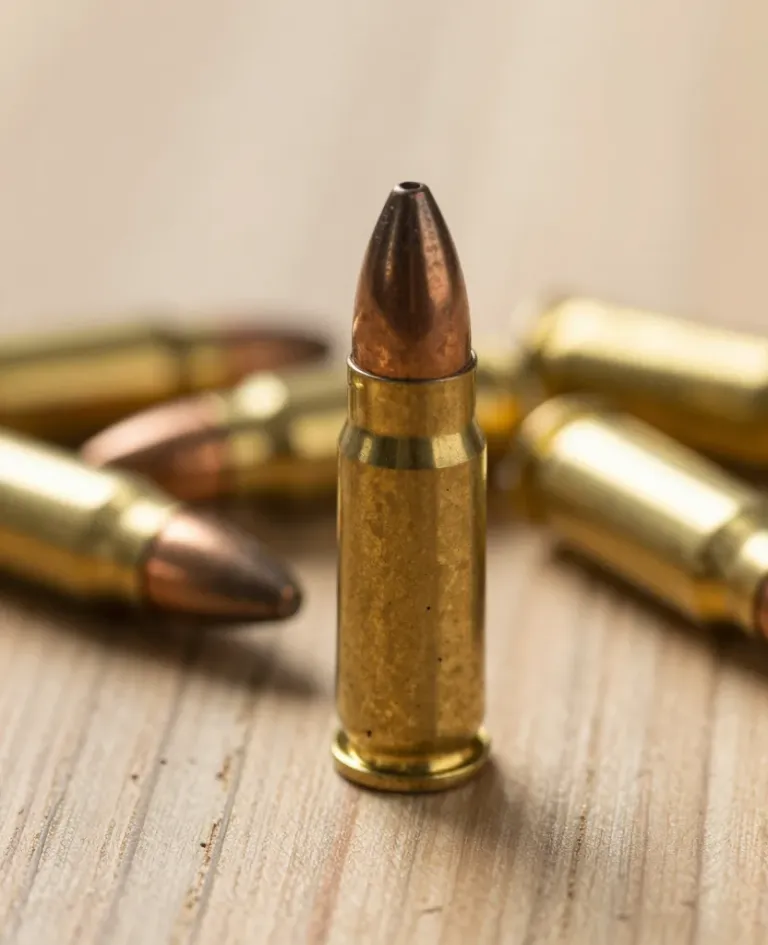 A single brass ammunition round stands upright on a wooden surface, its polished casing reflecting soft light while the copper-jacketed bullet shows slight oxidation. The shallow depth of field isolates the subject, with blurred rounds in the background enhancing focus and depth.