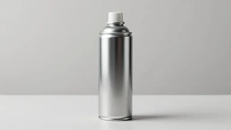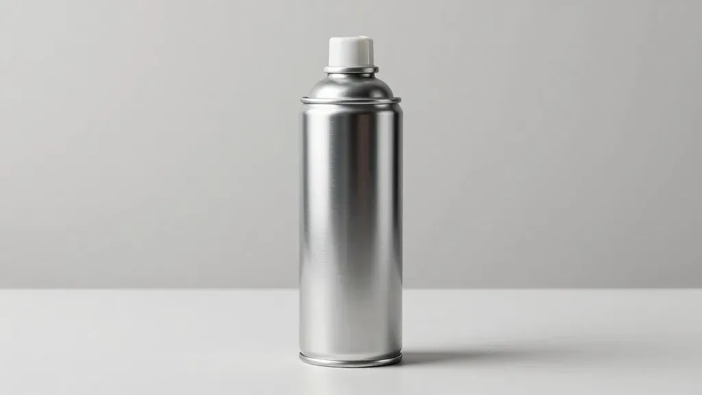 A silver aluminum spray can with a glossy finish reflects light, creating subtle highlights and shadows. The plain white background enhances the can's metallic sheen and provides ample copy space for design elements.