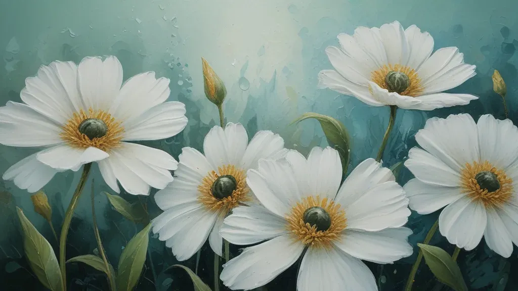 Soft, velvety white daisies with yellow centers are captured in various stages of bloom, set against a cool blue, misty, textured background. The diffused, soft lighting highlights the delicate petals and creates a serene, almost abstract atmosphere.