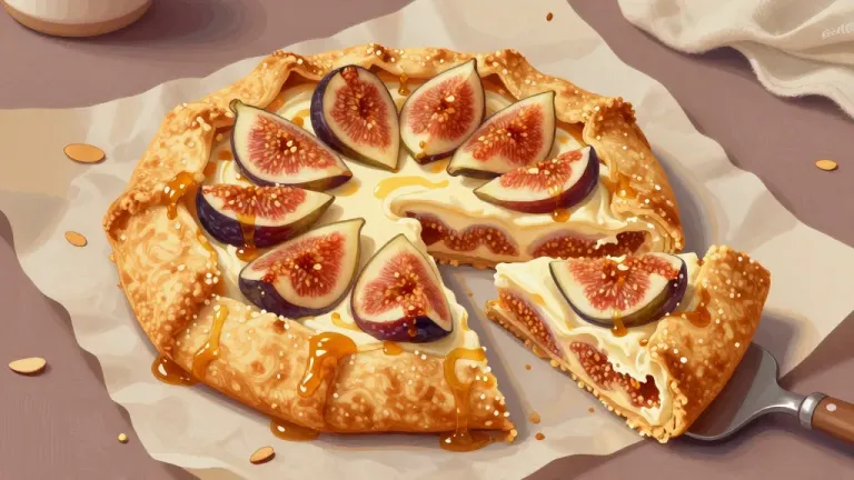 A golden-brown Fig-Almond Galette with glossy figs and a creamy filling, drizzled with amber honey, invitingly displayed with a slice cut out, highlighting its flaky texture and warm, soft lighting.