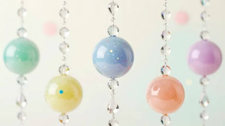 Glossy, translucent glass baubles suspended by clear crystal chains, softly illuminated to highlight their surfaces against a blurred pastel bokeh background. Shallow depth of field draws focus to the baubles, creating a dreamy, ethereal atmosphere.