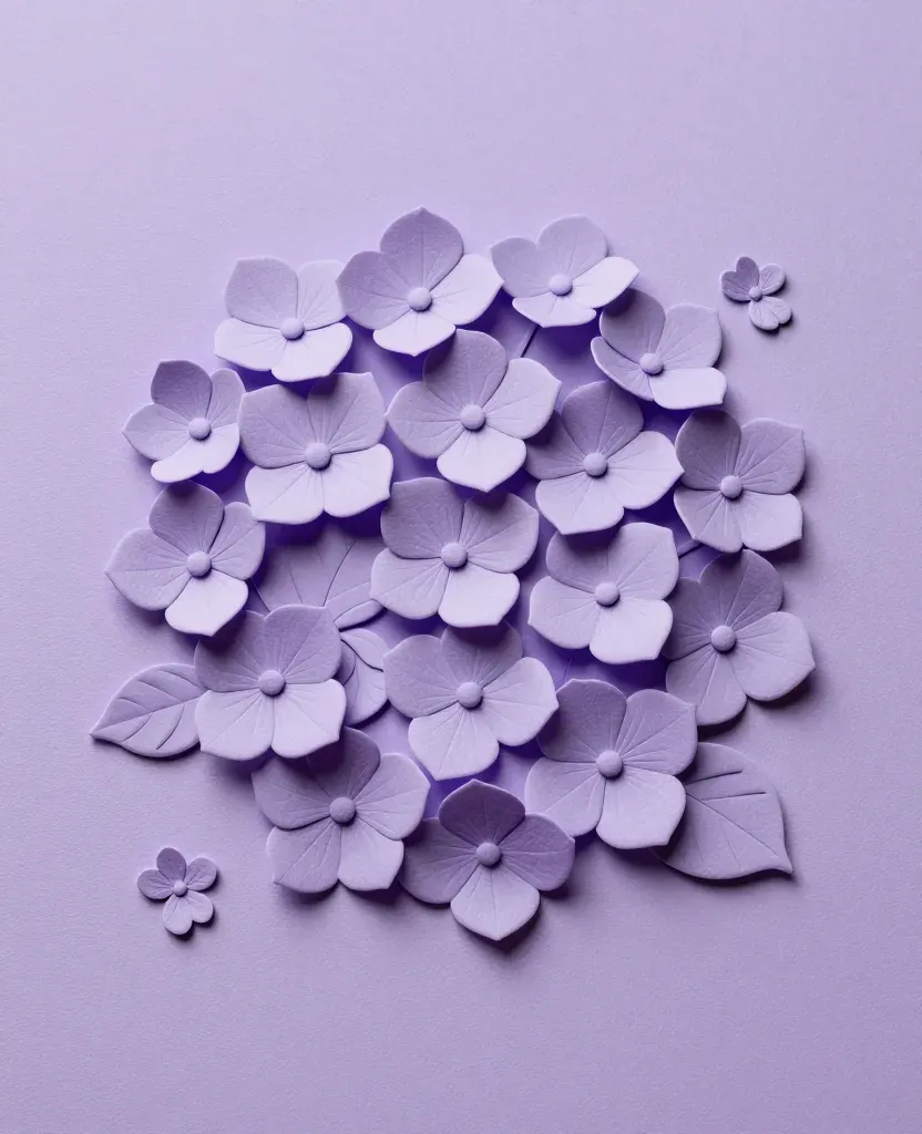 A soft, glossy cluster of lavender hydrangea flowers arranged in an organic, curved pattern, subtly highlighted by diffused light that accentuates their delicate curves and creates gentle shadows. The pale lavender background is blurred to emphasize the flowers, providing a clean and focused composition.