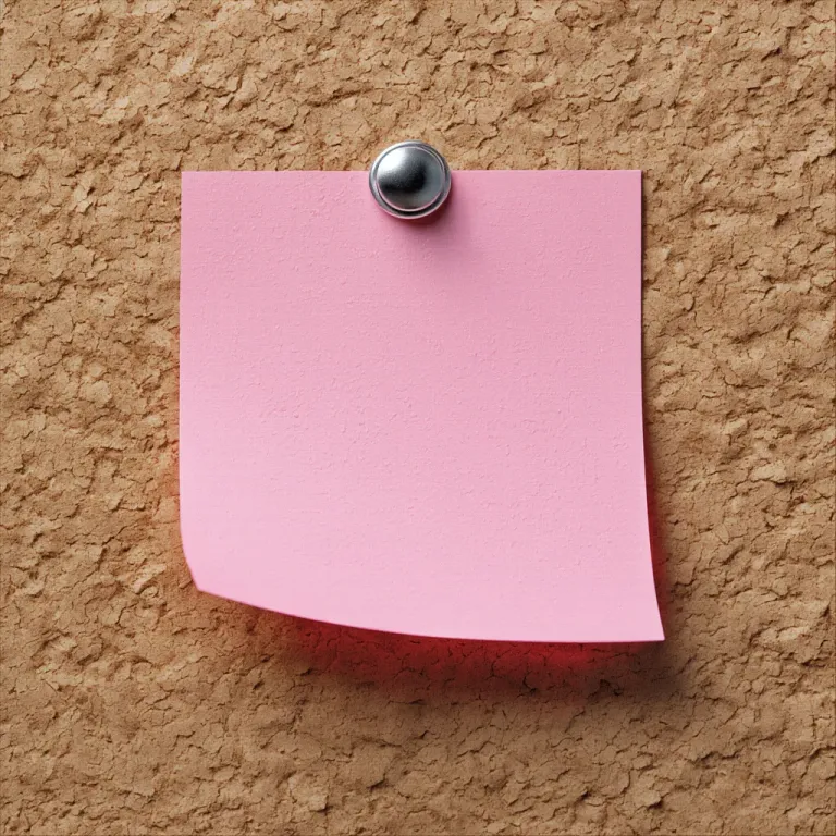 A smooth, glossy pink sticky note is pinned to a rough, grainy cork board under soft, diffused lighting that creates gentle shadows and highlights. The shallow depth of field draws attention to the note, emphasizing its texture and the natural pattern of the background.
