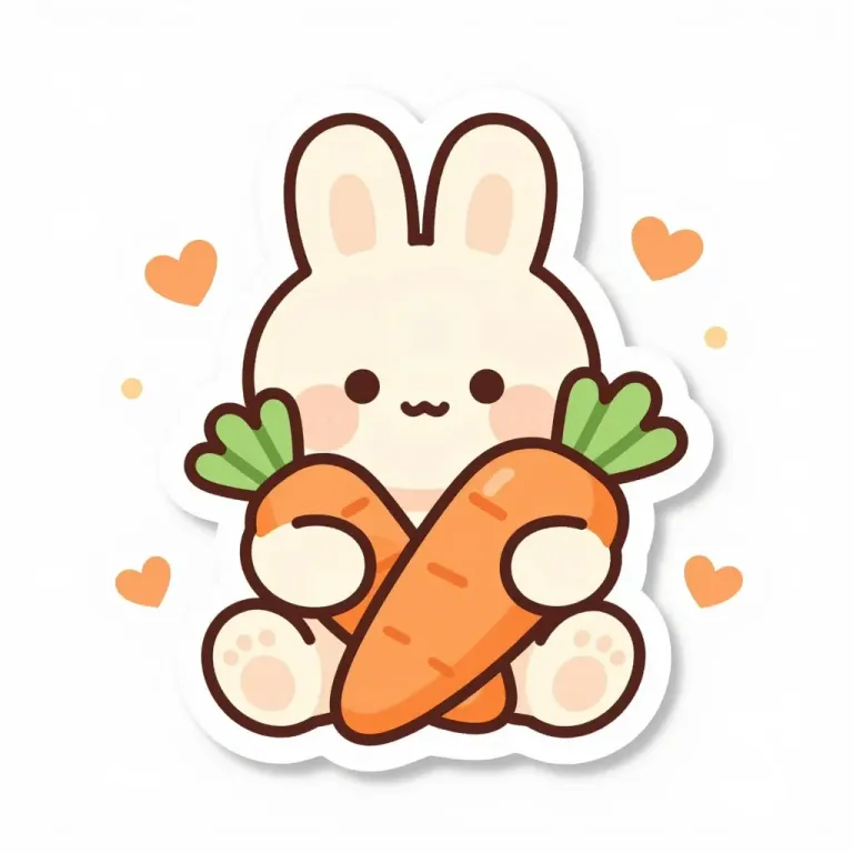 A cute bunny holds glossy carrots with soft, plush fur, highlighted by diffused, warm lighting. The clean, white background ensures the focus remains on the playful and charming subject.