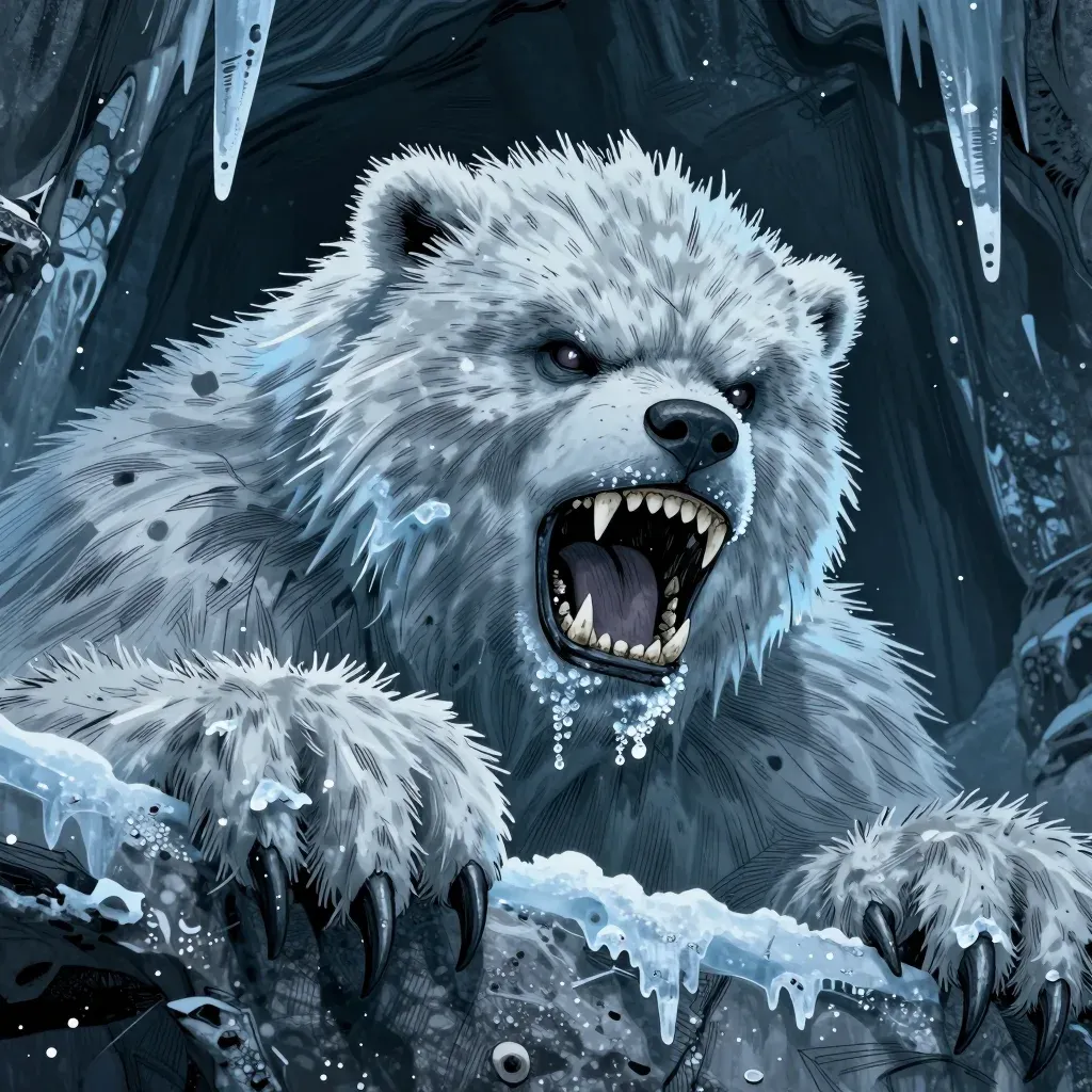 A yeti-like creature roars with fury, its fur matted and icy, reflecting the harsh, cold light that illuminates the scene. The frozen cave background, with icicles hanging, adds depth and a sense of isolation, creating a powerful and evocative image.